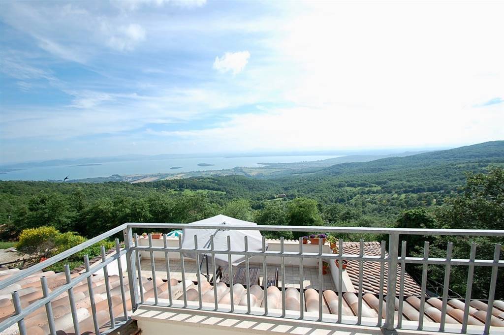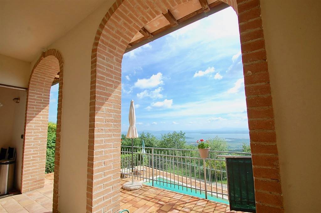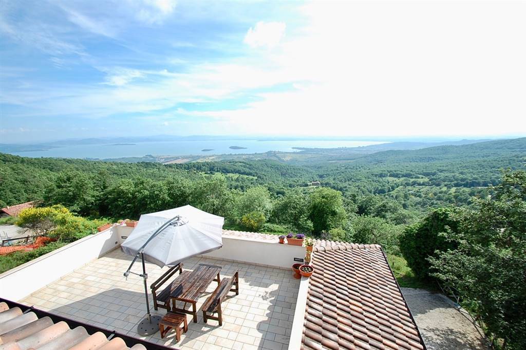 Questa villa moderna si trova in posizione collinare alta, con una vista strepitosa su tutto il lago Trasimeno e le sue isole! 'E stata costruita nel 2008 ed è composta da 3 abitazioni, con al piano terra, sopra la piscina, 2 appartamenti per ospiti con ciascuno soggiorno, 1 camera e terrazza, e al 1° e 2° piano l'abitazione principale, spaziosa e luminosa, con un grande portico e terrazza panoramica, soggiorno open space, cucina design, 3 camere, 3 bagni. L'abitazione a basso consumo energetico è ben coibentata ed ha il riscaldamento sotto il pavimento, ideale come prima casa e per affittare gli appartamenti, godendosi sempre il magnifico panorama!