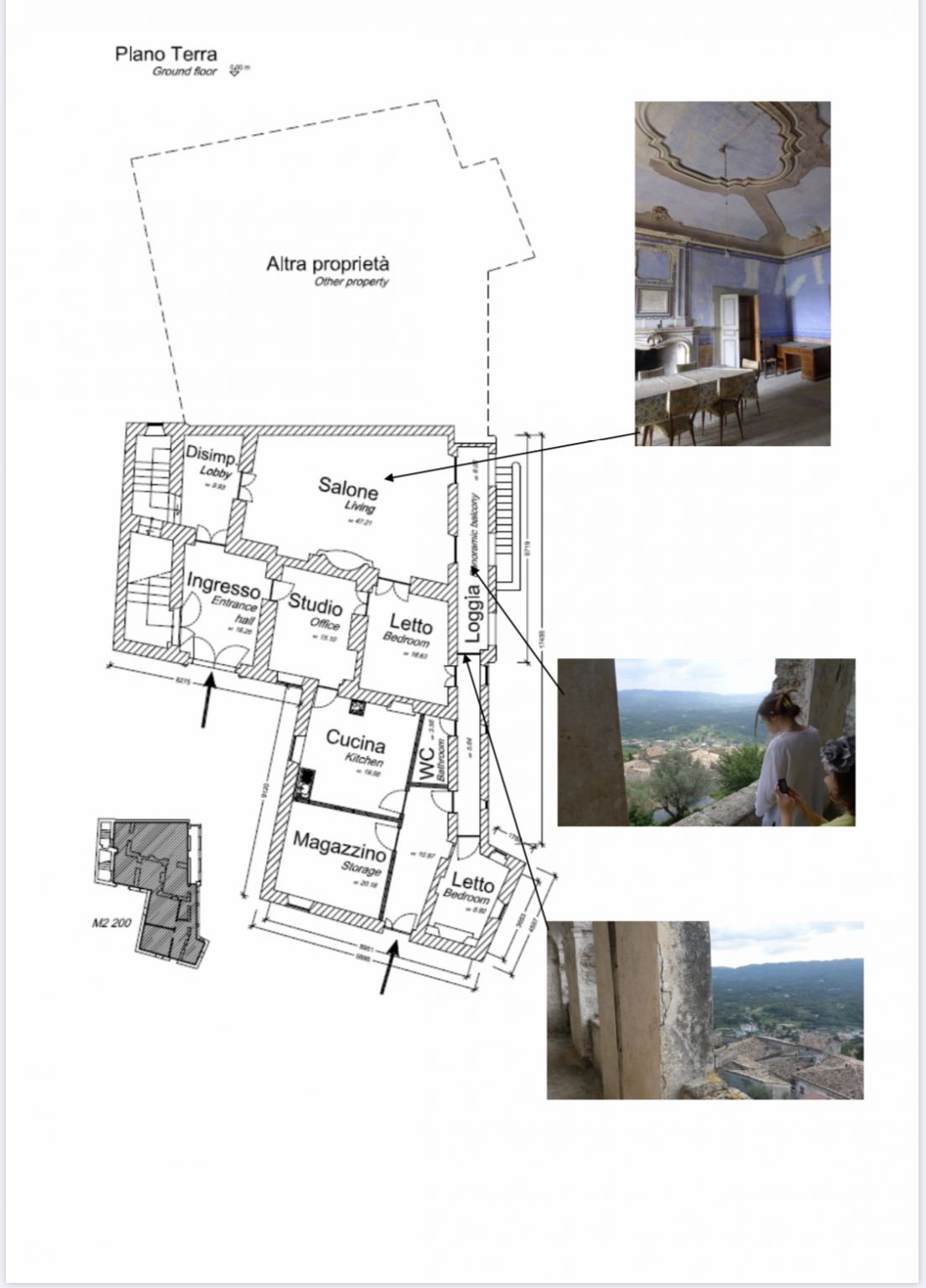 Il piano superiore è composto da cinque ampi vani e disimpegni, adattabili a diverse esigenze, mentre il piano seminterrato ospita grandi cantine d'epoca, da cui è possibile accedere al giardino e al retro del palazzo, un'area suggestiva che conserva intatto il fascino medievale con le sue logge e la struttura in pietra viva. Qui, attraverso un'antica scala in pietra, si può raggiungere il centro abitato del borgo, fuori dalle mura del castello.