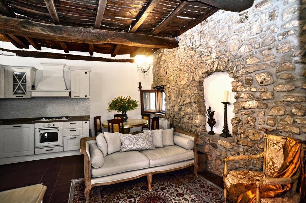 C'è un antico tavolo da cucina in legno e sedie, un divano imbottito in lino, tappeto persiano, lampadario di Murano e drappeggi di seta grezza su misura, che valorizzano ulteriormente le pareti in pietra e il vecchio soffitto in legno. La cucina è completamente attrezzata con piano cottura, forno, frigorifero e lavatrice.