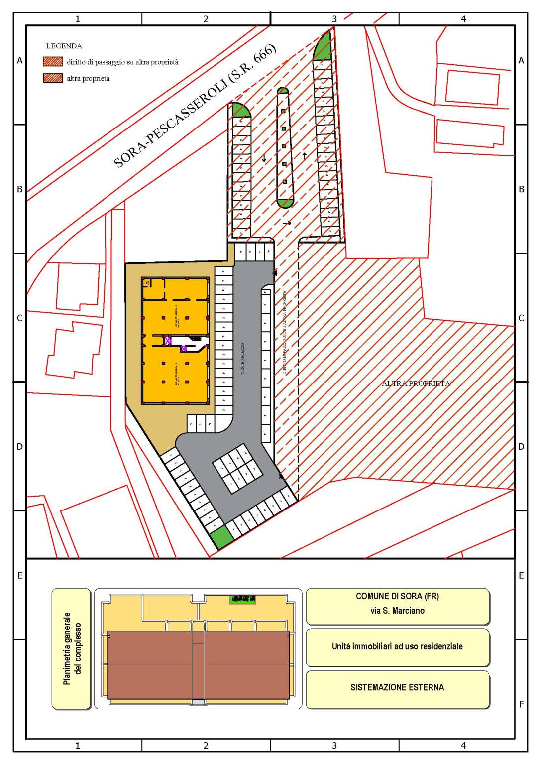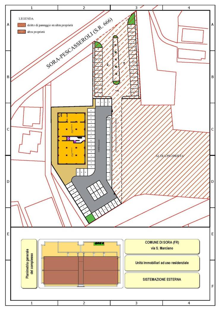 - Il complesso immobiliare, con accesso diretto alla SS. 666, è situato nei pressi di un crocevia stradale strategico: vicino all'uscita "Sora centro" della Superstrada Avezzano-Cassino ( distanza circa 800 m), a poche decine di metri dall'incrocio con via Marsicana ed a breve distanza dal centro città (circa 1000 m dall'attuale Caserma dei Carabinieri). Altre distanze dai punti strategici più prossimi sono le seguenti: m 700 dall'ospedale cittadino SS. TRINITA'; cm 700 dall'eliporto; m 850 dalla Caserma militare (Corpo speciale esercito reggimento "Cordenons").