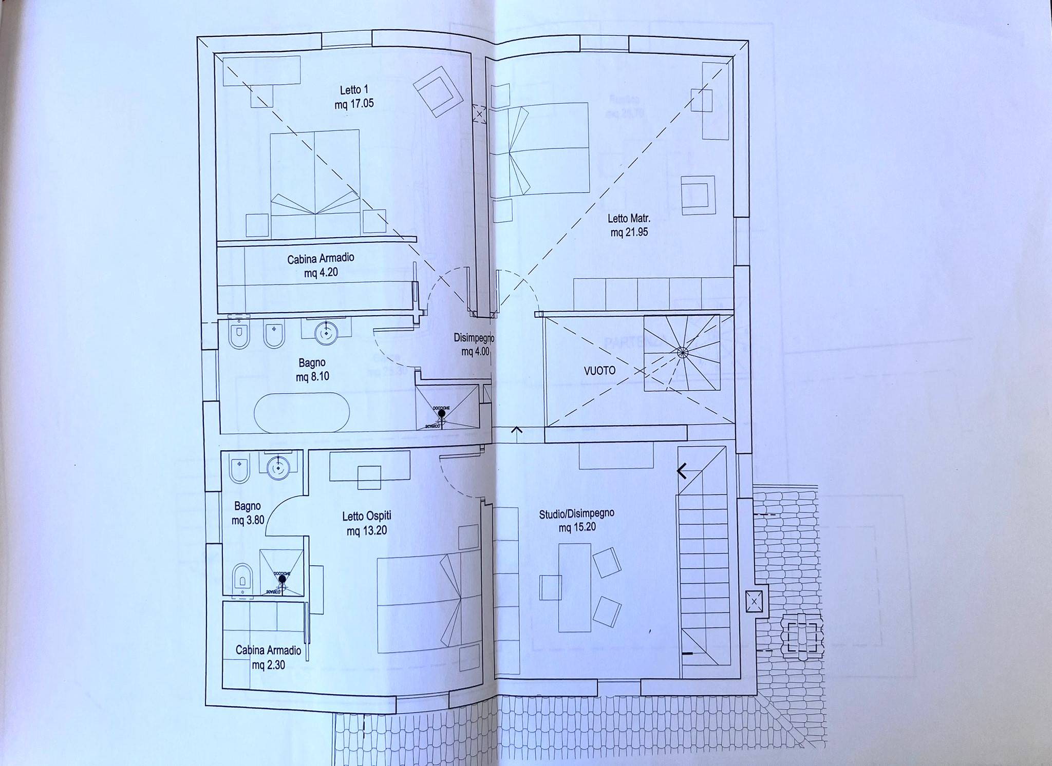 La villa si sviluppa su tre livelli e offre ampi spazi interni, con rifiniture di pregio come cotto, gres, travertino e parquet svedese. Al piano terra, l'ingresso-disimpegno di 21 mq introduce la zona giorno, composta da un grande soggiorno di 30 mq, una zona pranzo-cucina open space di 20 mq e una camera ospiti di 16 mq. Completa il piano un bagno di 6 mq. La zona notte al primo piano include una camera matrimoniale di 22 mq, una seconda camera di 17 mq con dress-room di 5 mq, una terza camera di 14 mq con cabina armadio e bagno in camera, e un ampio studio/disimpegno di 15 mq. Un altro bagno con vasca completa questa zona della villa.