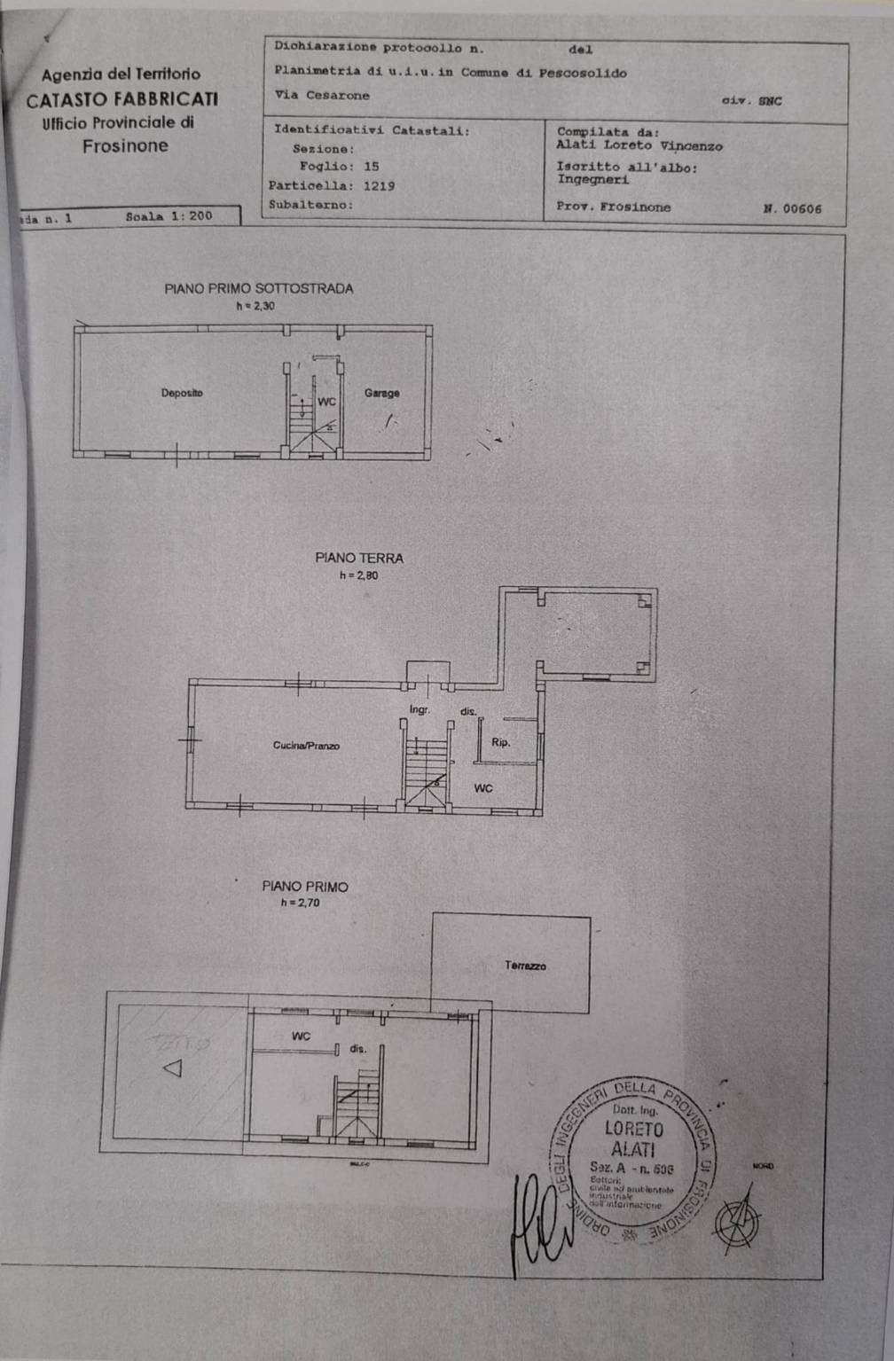 Situata in via Cesarone a Pescosolido (FR), questa villa si sviluppa su tre livelli. Al piano seminterrato troviamo una comoda taverna di 45 mq, un bagno e un garage di 20 mq. Il piano terra, destinato alla zona giorno, ospita un'ampia cucina con sala da pranzo, un bagno, un ripostiglio, vano scala e una prima camera da letto. Al primo piano, dedicato alla zona notte, due camere da letto e un bagno completano lo spazio, con accesso diretto da una delle stanze a un magnifico terrazzo panoramico di 30 mq.