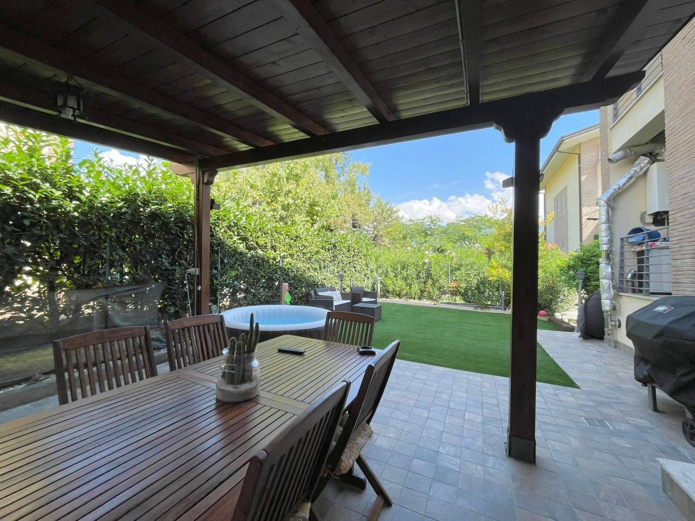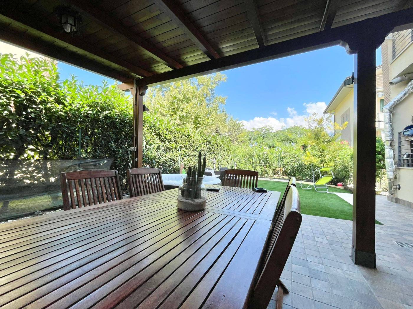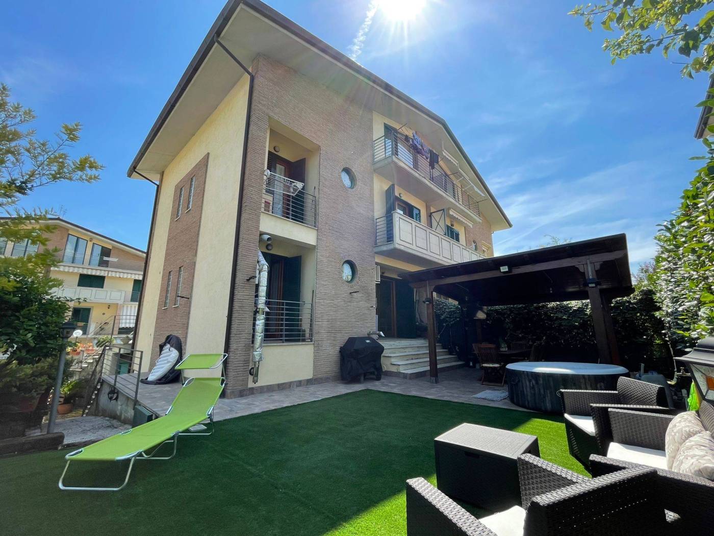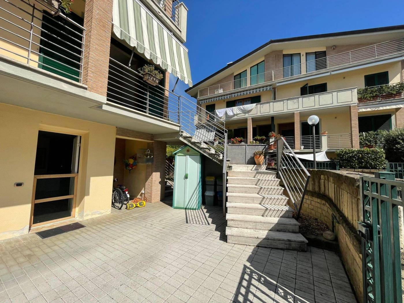 Nel signorile centro residenziale “Villaggio Erica” in via Trecce, zona svincolo Via Carrara/Campovarigno, proponiamo in vendita una elegante villa bifamiliare. Dall'ingresso con porta blindata, entriamo in una zona living dove gli ambienti sono tutti distribuiti con accessi diretti alle corti, il tutto progettato per sviluppare al meglio gli spazi, ma soprattutto per avere tanta luce naturale. Tutto in questi ambienti rispecchia luminosità, trasparenza, minimalismo. Il PIANO TERRA sapientemente rialzato (dall'ingresso piano terra con cancelletto), è adibito a zona giorno, sviluppandosi in un unico ambiente, La loro destinazione d'uso marcata dal pavimento color rovere chiaro, gli ambienti cucina/pranzo si affacciano sulla zona living/soggiorno di 35mq, luminosa ed accogliente, dalle grandi aperture alla luce naturale data dai grandi finestroni con accesso alla balconata esterna di 13mq estesa alla corte retrostante di 120mq, sapientemente adibita a zona conviviale con gazebo in legno e prato sintetico, dove poter godere di giornate in relax o di serate in compagnia. Al PRIMO PIANO la zona notte si sviluppa su due camere da letto rispettivamente di 10mq e l'altra di 16 mq entrambe con accesso ai balconi. Interessanti ambienti notte, tutti con pavimentazione in laminato color rovere chiaro, camere ampie moderne con stile giovanile e fresco. La camera padronale di 16 mq, anch'essa con affaccio sul balcone ci accoglie in un ambiente dal carattere classico degli arredamenti al tocco di modernità delle pareti. Un disimpegno di 8mq., un bagno di 6mq con apertura al balcone e con box doccia di ultima generazione dotato di idromassaggio. L'ultimo ambiente della casa è il PIANO SECONDO, una zona sottotetto praticabile di 40mq. con balconi totali di 14mq., un ripostiglio di 8mq. Una camera da letto di 10mq, con armadio a muro, e la seconda camera da letto di 10mq. adibita a studio, un bagno/lavanderia di 9mq., con box doccia ed affaccio su balcone di 10mq. Il sottile fascino romantico che il sottotetto esercita, in passato la tipica abitazione degli artisti, oggi si trasforma in abitazione comoda e confortevole. Il PIANO SEMINTERRATO (terra da ingresso) prevede un garage di circa 35 mq. con serranda automatica, ed una zona di circa 20mq per varie funzionalità. L'immobile è dotato di molteplici confort: impianto termico sezionato per risparmio energetico in gas metano ma anche in pellet, infissi in doppio vetro, zanzariere nella zona giorno, tende parasole, autoclave di 500 litri, impianto di allarme, condizionatori, impianto depurazione acqua, impianto televisione anche in corte esterna sotto gazebo, cancello automatizzato, basculante automatizzata, controsoffittatura con luci led. Il contesto signorile, silenzioso e ben curato, ha un costo di condominio per la cura e manutenzione esterna del residence di Eu. 20,00 mensili. Soluzione immobiliare elegante e signorile.
